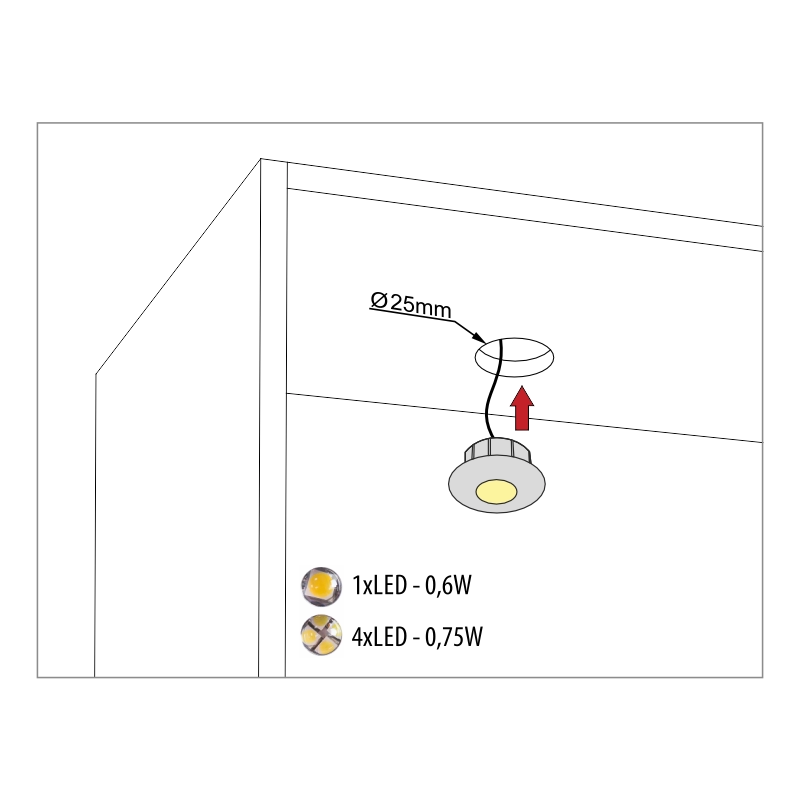 Użytkownicy mają do wyboru dwie wersje mocy: oszczędną 0,6 W z jedną diodą LED lub nieco mocniejszą 0,75 W wyposażoną w cztery diody. Oprawa pracuje pod bezpiecznym napięciem 12V DC i posiada fabryczny przewód o długości 2 metrów, co ułatwia prowadzenie instalacji w zabudowie meblowej. Solidna obudowa w kolorze aluminium doskonale komponuje się z różnymi stylami wykończenia.